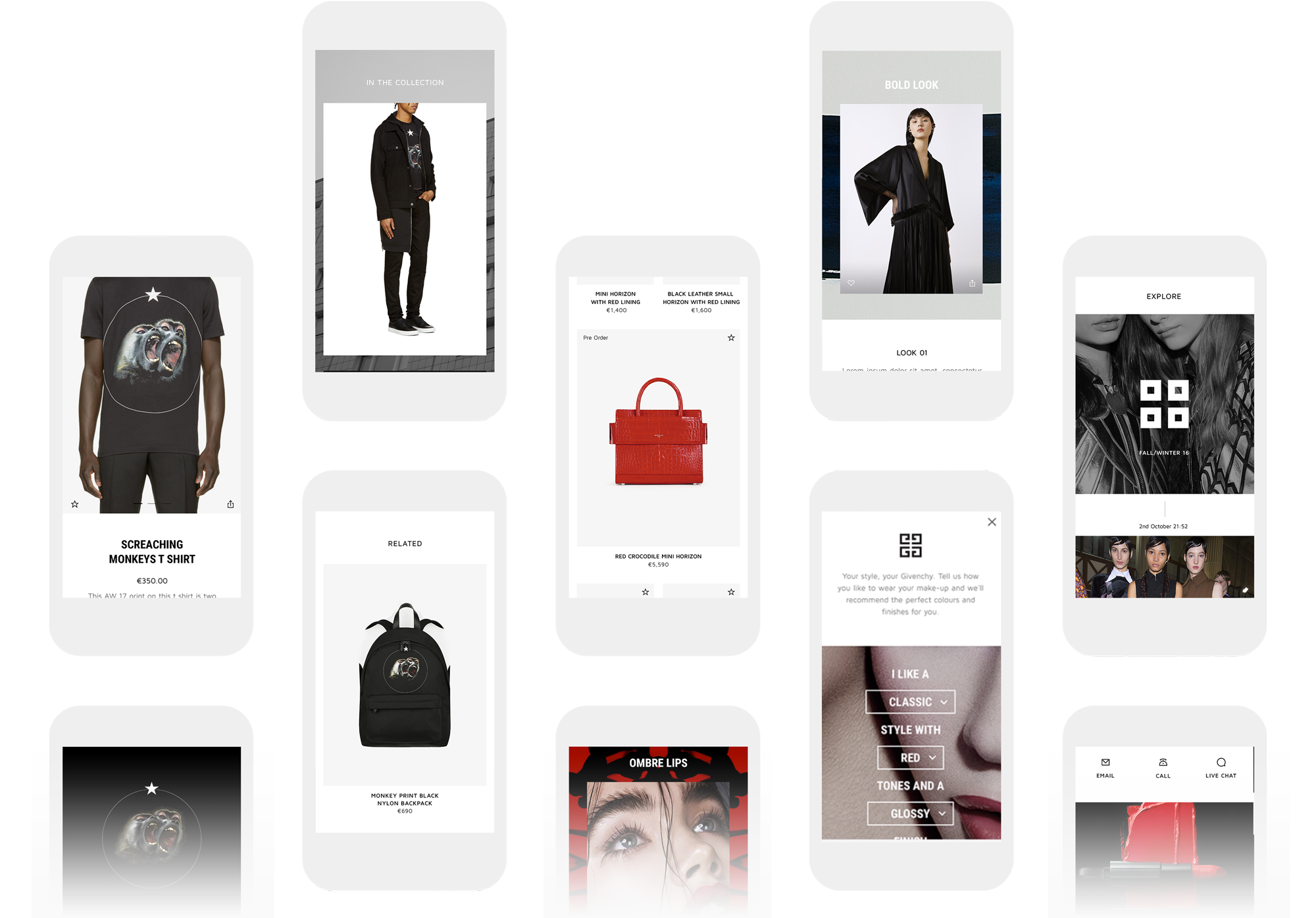 Both channels were redesigned from the ground up, creating an experience that feels distinctly Givenchy. Connected services link to boutiques, collection themes inform storytelling, and the interface builds on decades of brand heritage.